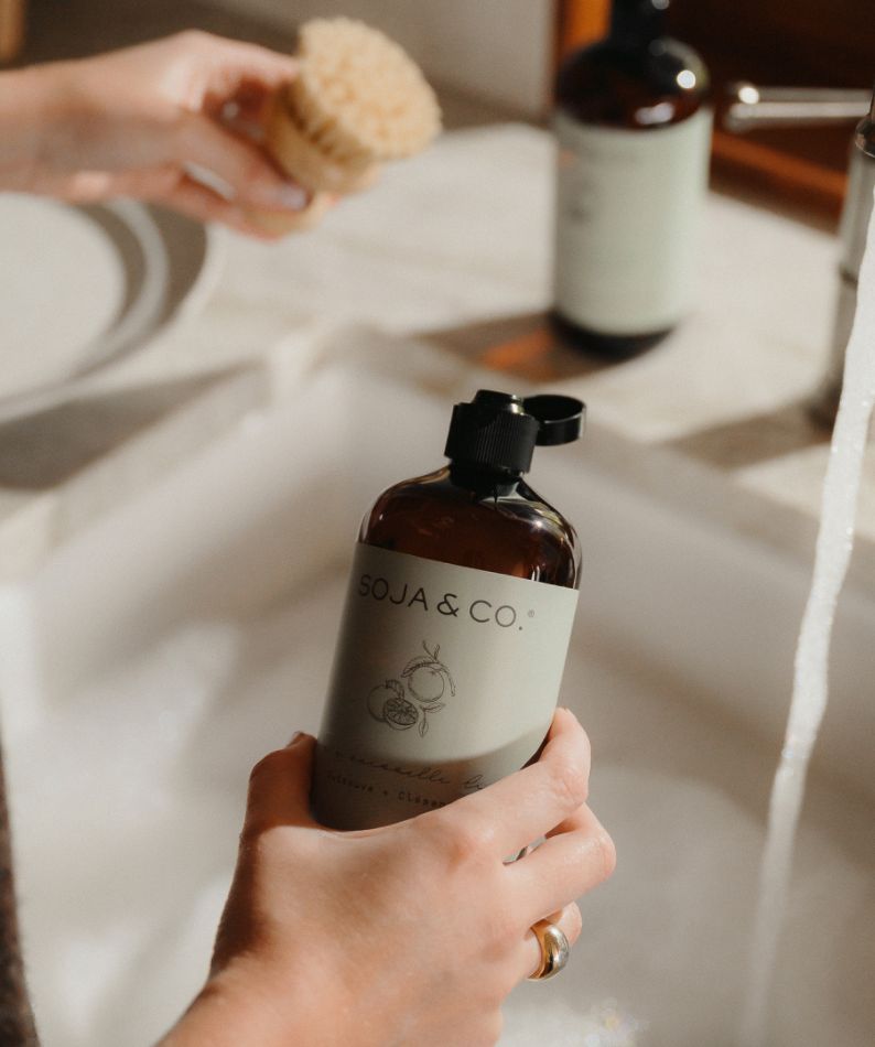 Discover SOJA&CO.'s natural dish soap: vegan, B Corp certified, made in Quebec. Transparent ingredients, natural scents, and surprising uses. Available in 3 scents + Thyme + Coconut seasonal edition.
